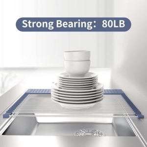 SUS304 Stainless Steel With High Quality】: Made of SUS304 stainless steel and with food-grade durable material, the foldable drying rack is sturdy, rustproof, non-slip, and waterproof. It supports 80 lbs and is not easily bent or twisted by heavy cookware for durability