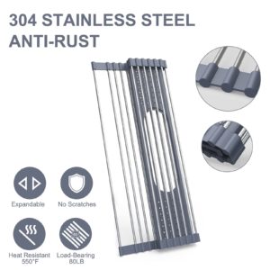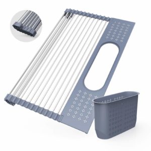 New Collapsible Dish Drying Rack Upgraded】: The roll-up dish drying rack makes getting the dishes dry and off the counter easy. and this dish rack over sink comes with removable utensil baskets; no more worries about your spoons, forks, knives, lids, baby's little items.The sink roll up drying rack is good for kitchen organization.